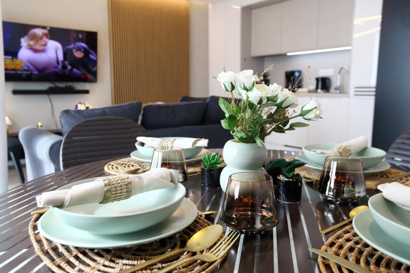 Apartament z 1 sypialnią. This apartment consists of 1 living room, 1 separate bedroom and 1 bathroom with a walk-in shower and free toiletries. Meals can be prepared in the well-fitted kitchen, which is equipped with a stovetop, a refrigerator, a dishwasher and kitchenware. The air-conditioned apartment provides a flat-screen TV with cable channels, a washing machine, a tea and coffee maker, a seating area as well as sea views. The unit offers 2 beds. Apartament - 4 osobowy. Powierzchnia pokoju ok.: 44 mkw.
